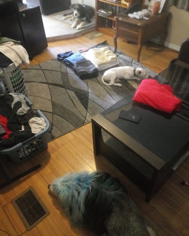 Gambit (my 7 year old Old English Sheepdog) tends to not enjoy the constant interaction with other dogs, much less a rambunctious puppy. He will go find himself somewhere to lay down outside of the reach of the other dogs or just off to the side. Because we teach existence, we encourage his desire by making sure that the other dogs do not bother him at this time, especially the puppy.